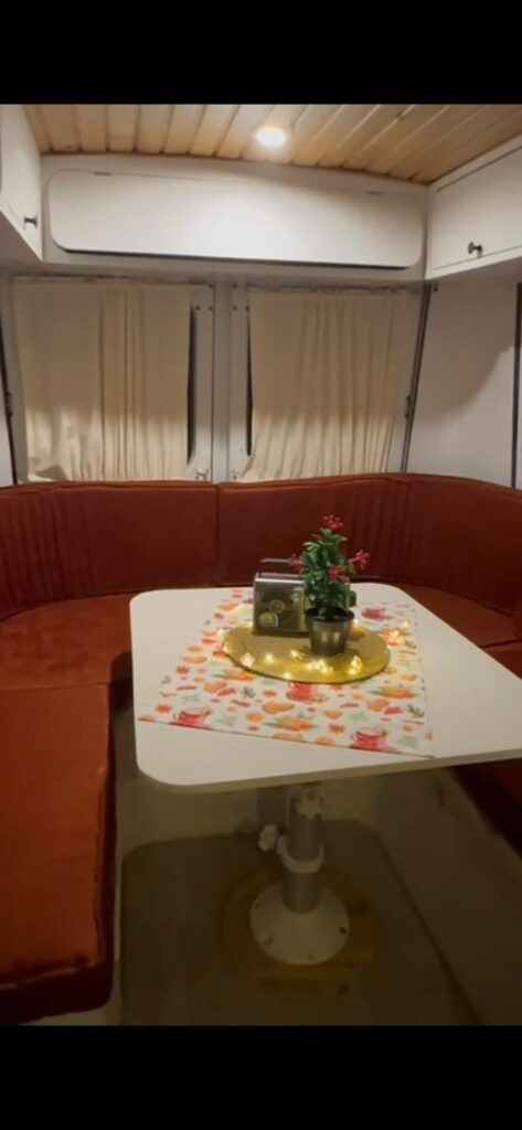 Mutfak ocağı, çift kişilik yatak olabilen oturma grubu ve banyo, tuvaleti bulunur